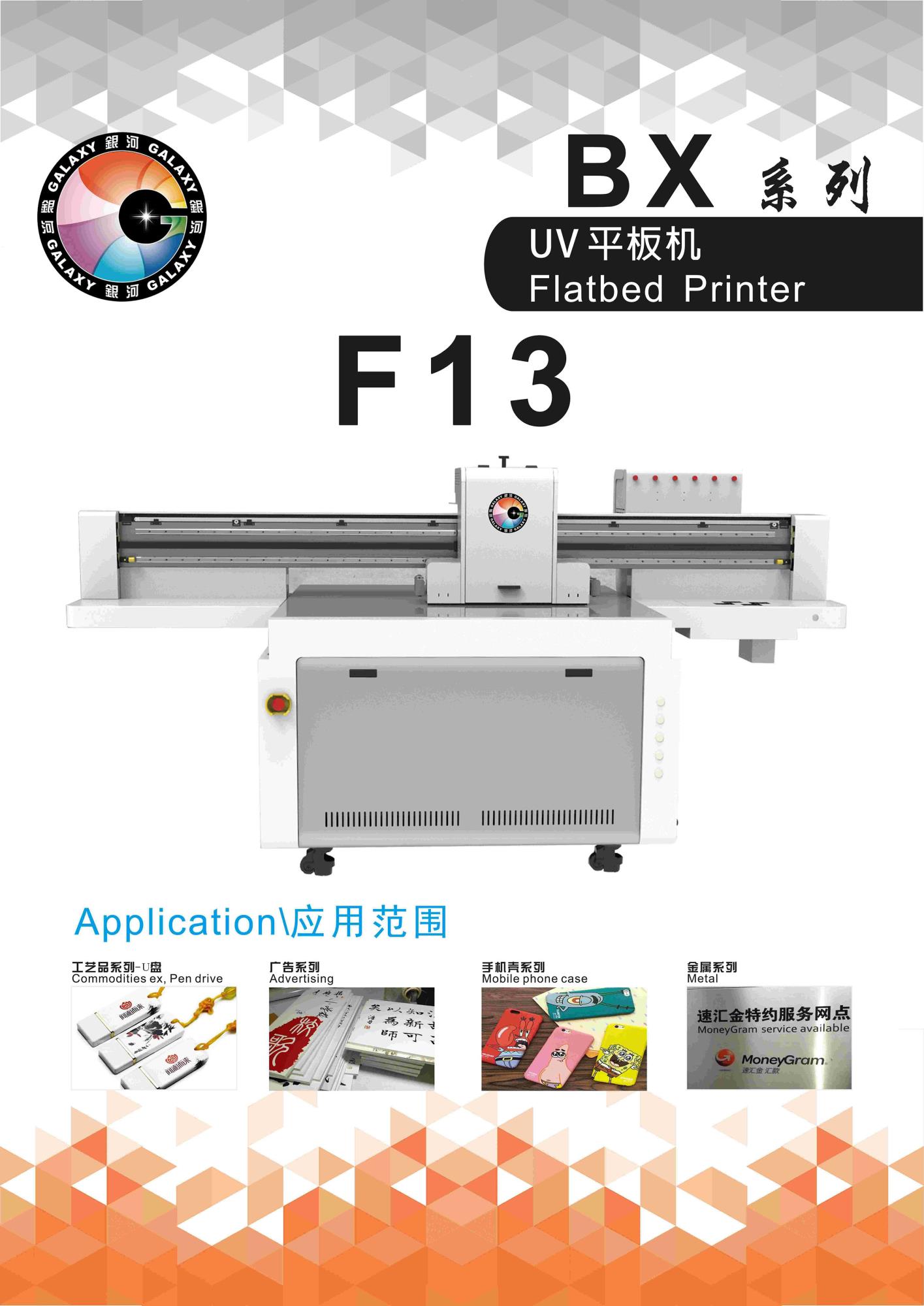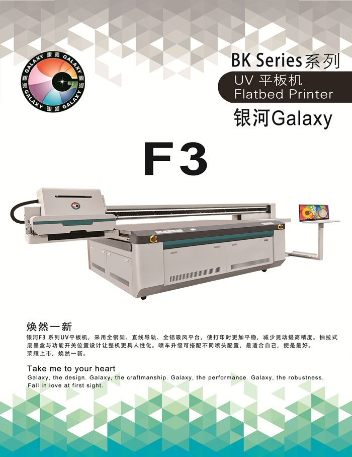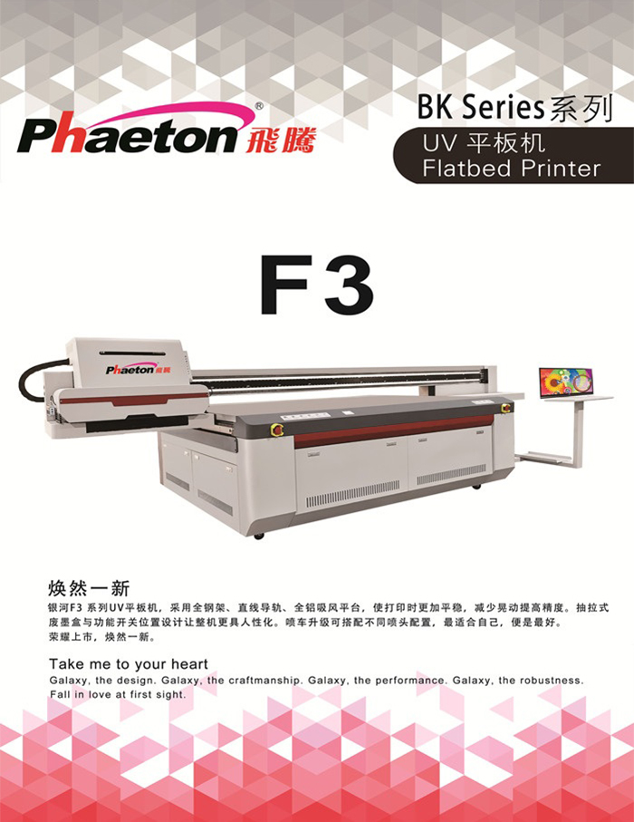 銀河F3系列UV平板機(jī),采用全鋼架、直線導(dǎo)軌、全鋁吸風(fēng)平臺(tái),使打印時(shí)更加平穩(wěn),減少晃動(dòng)提高精度。抽拉式廢墨盒與功能開(kāi)關(guān)位置設(shè)計(jì)讓整機(jī)更具人性化。噴車(chē)升級(jí)可搭配不同噴頭配置,最適合自己,便是最好。 榮耀上市,煥然一新。